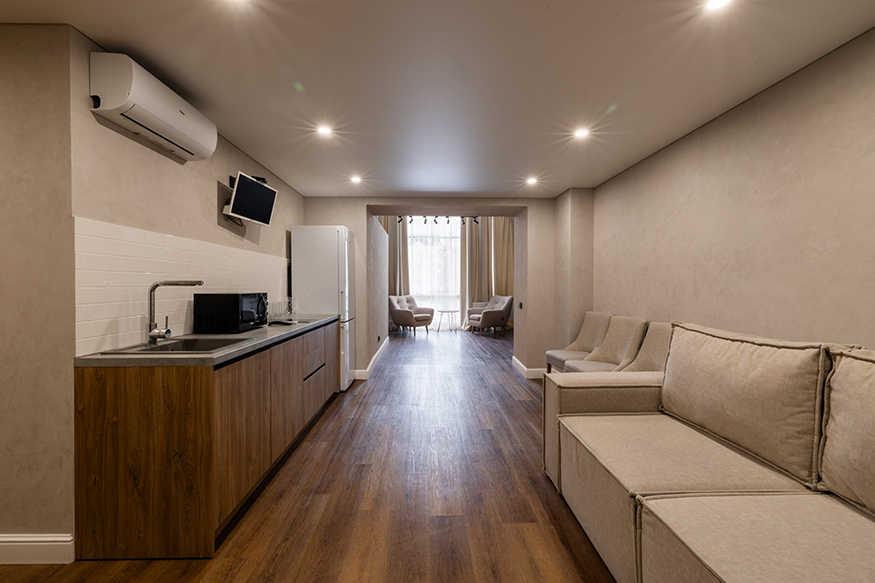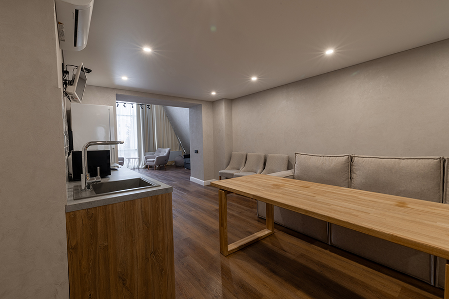 Ощутите простор в нашем номере, где большое панорамное окно открывает захватывающий вид. Для вашего комфорта предусмотрена кухонная зона, двуспальная кровать и два удобных раскладных дивана.*Внешний вид номера может отличаться от представленного на фото.
