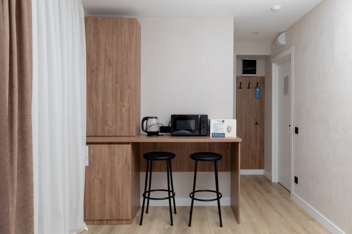 Просторный однокомнатный номер для двоих с большой двуспальной кроватью.