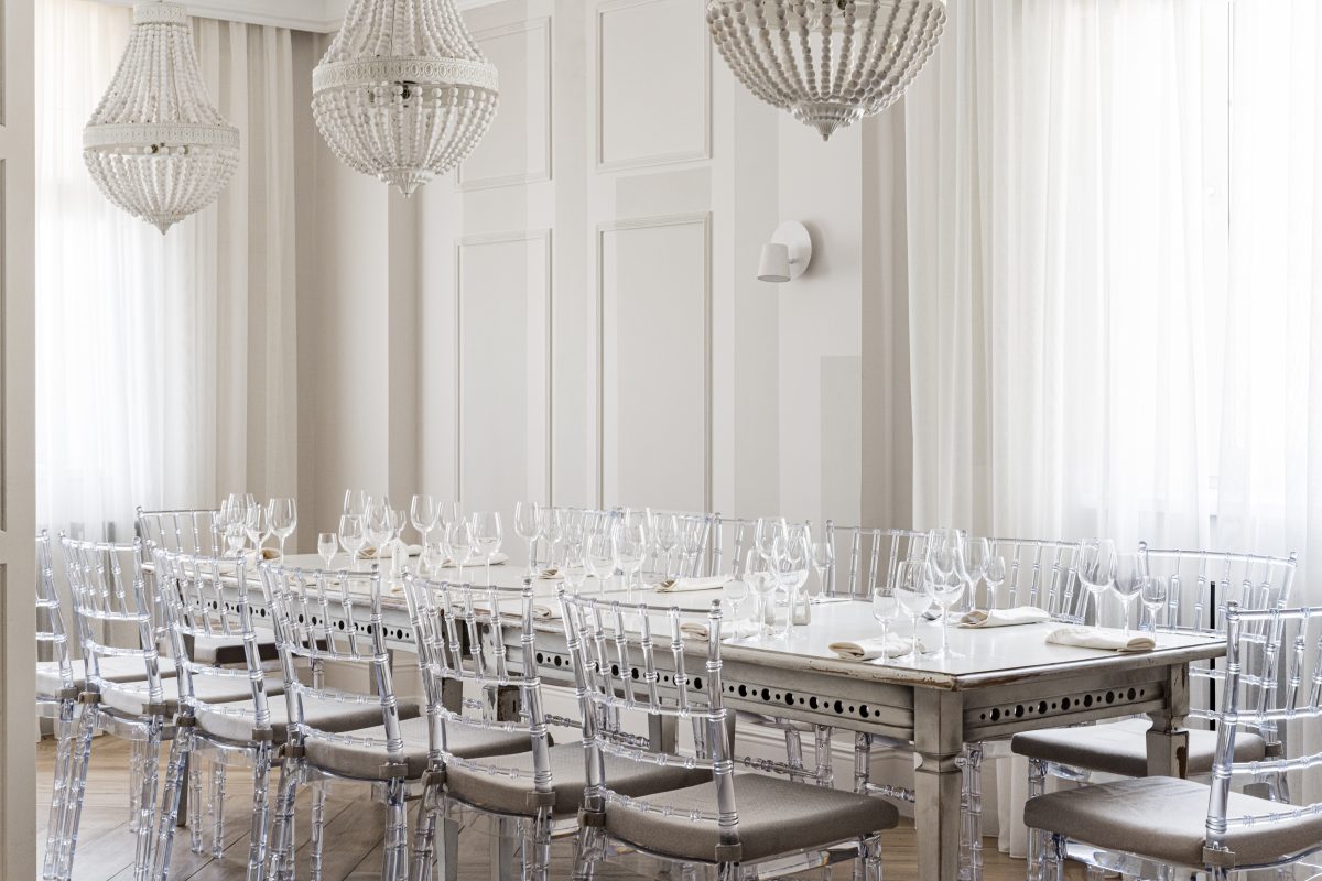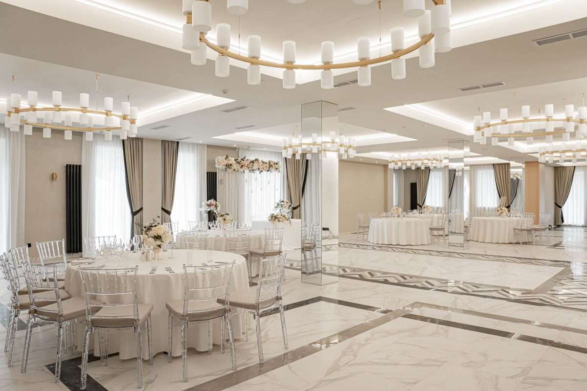 Большой банкетный зал вместимостью 200 человек с элегантным белым интерьером идеально подходит для конференций и пышных праздников. Светлый, просторный зал создаёт праздничную атмосферу и комфорт, обеспечивая успешное проведение важных мероприятий и торжеств любого масштаба.